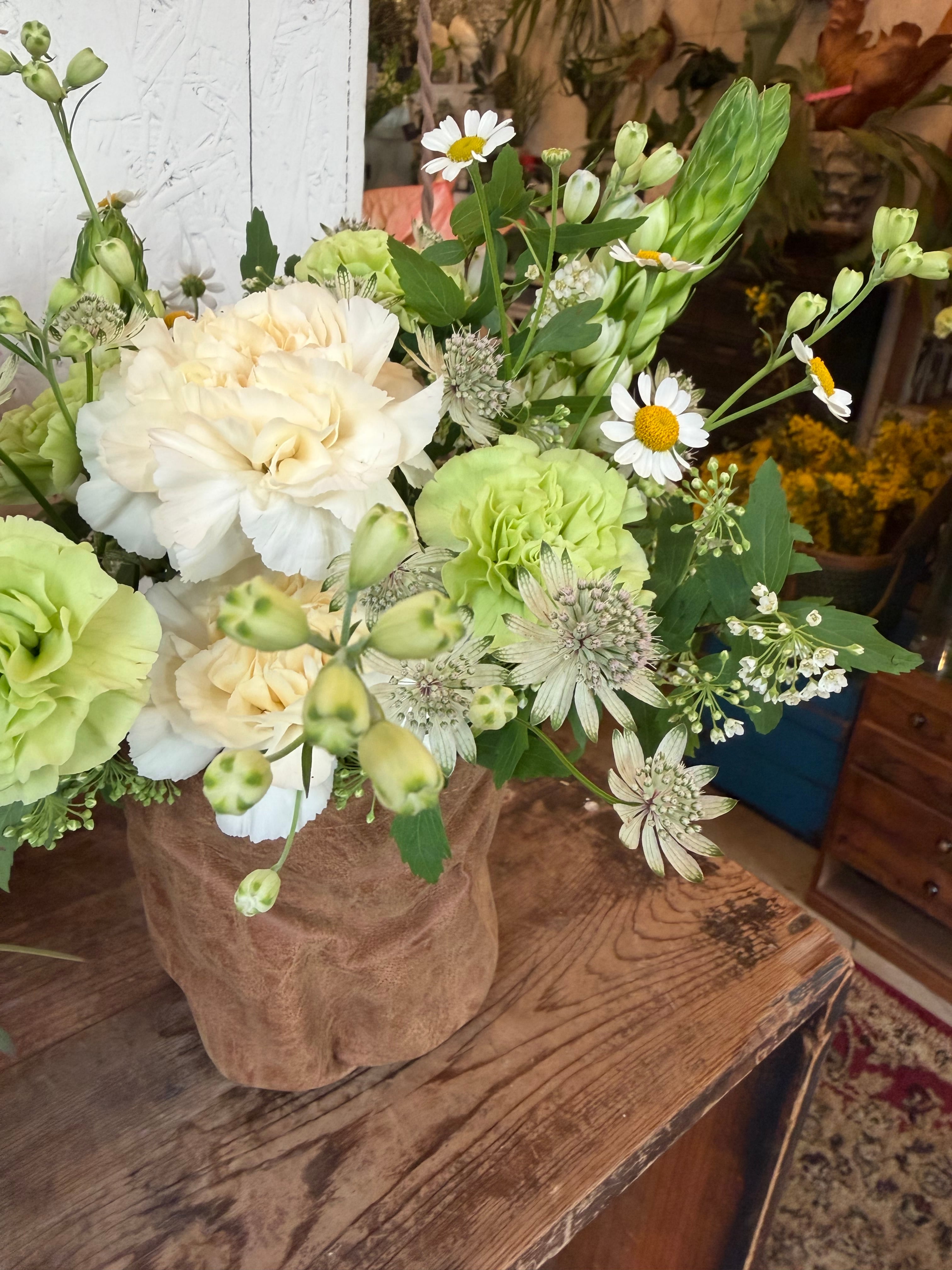 今年はレザーの器にお花をご用意します。