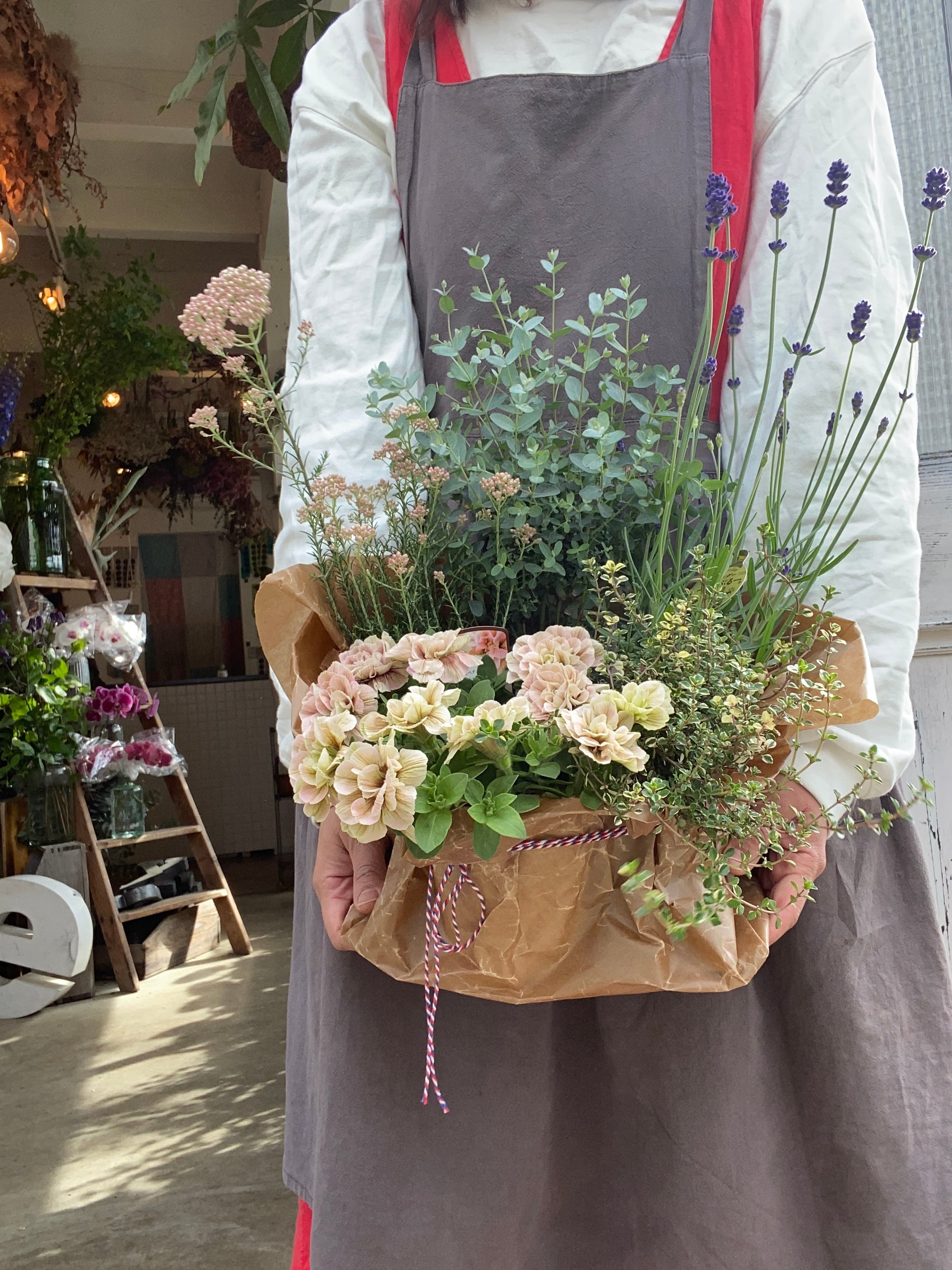 外に植えることのできる苗を4~5個セットにしてラッピングさせて頂きます