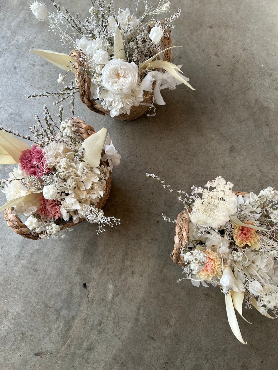 プリザーブドフラワーは、1年以上の長期間鮮花のような美しさを保つことができるため、長く愛されるプレゼントとしておすすめです。籠のセットになっていて、一緒に飾るとさらにかわいいです。