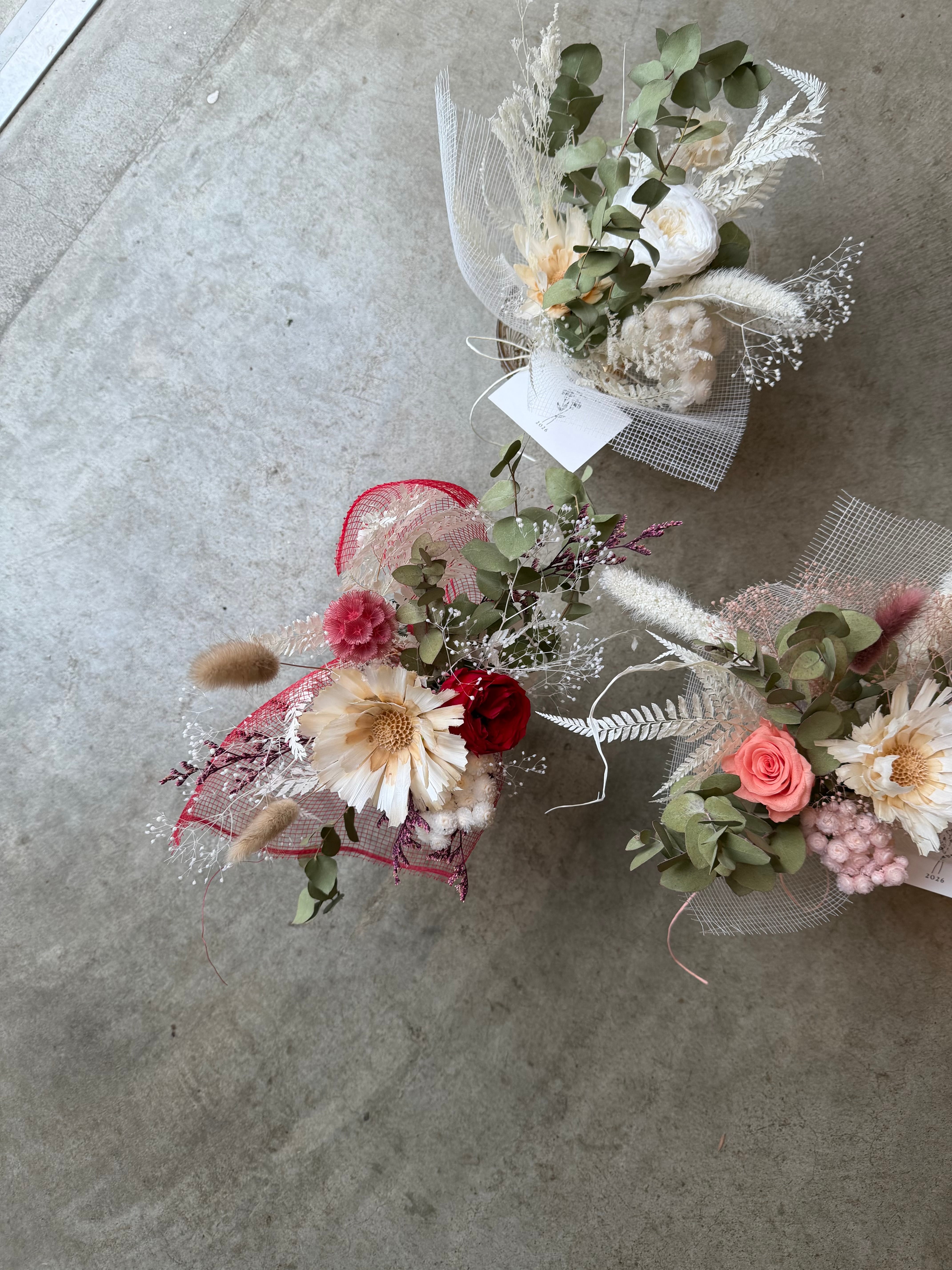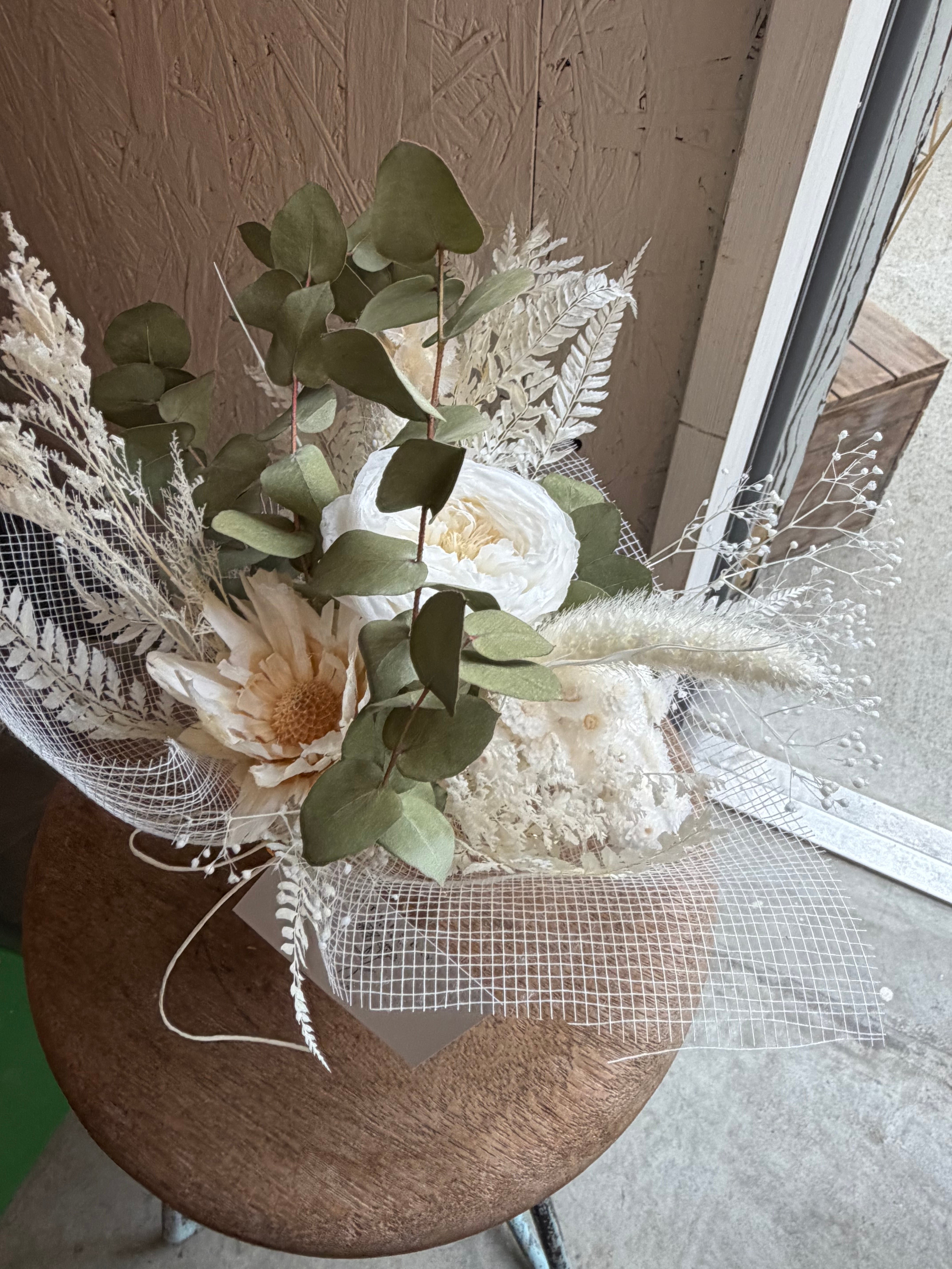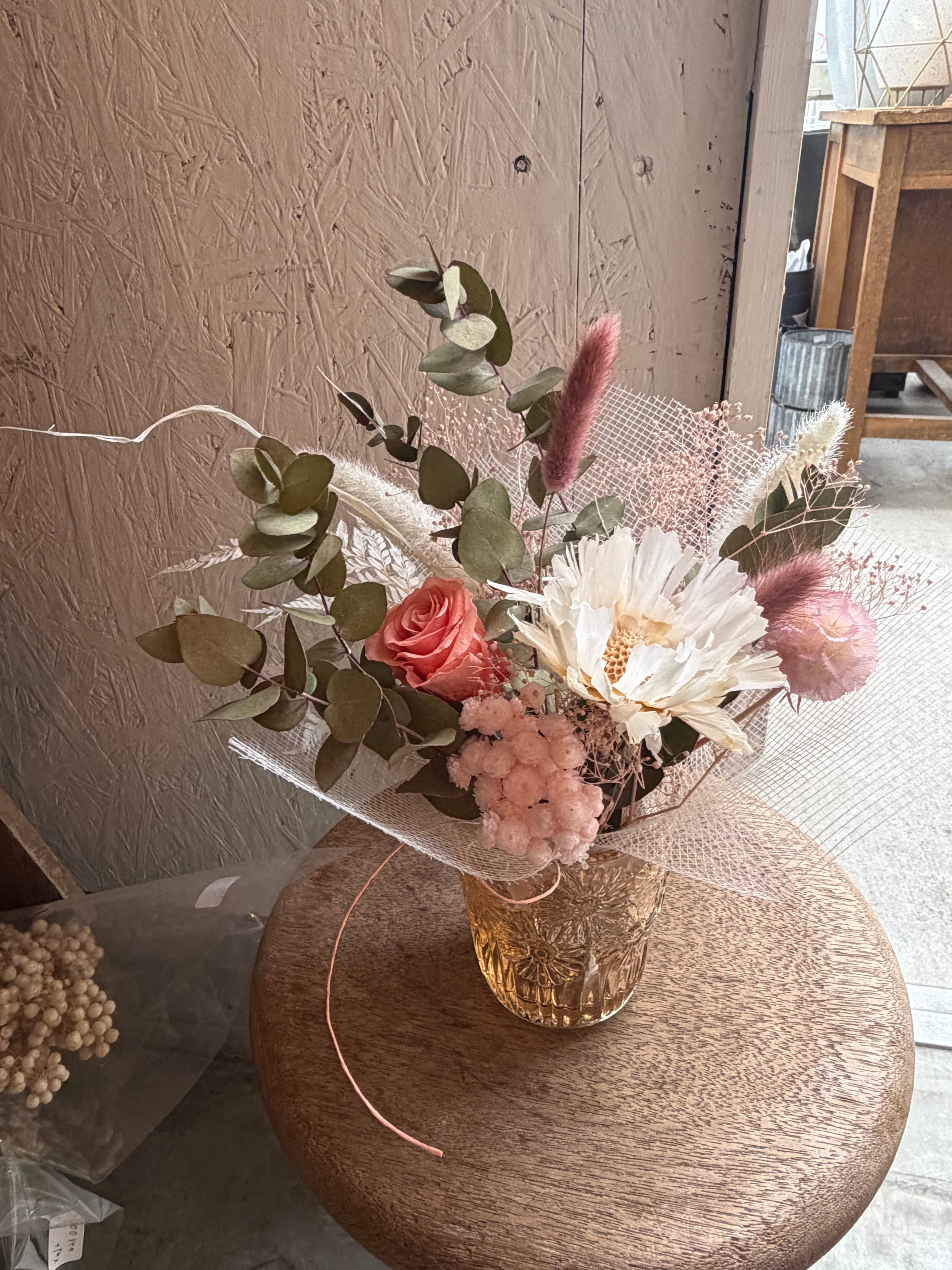 今年はレトロ感のあるマーガレットのグラスに、プリザーブドフラワーとドライフラワーをミックスしたブーケを添えました。