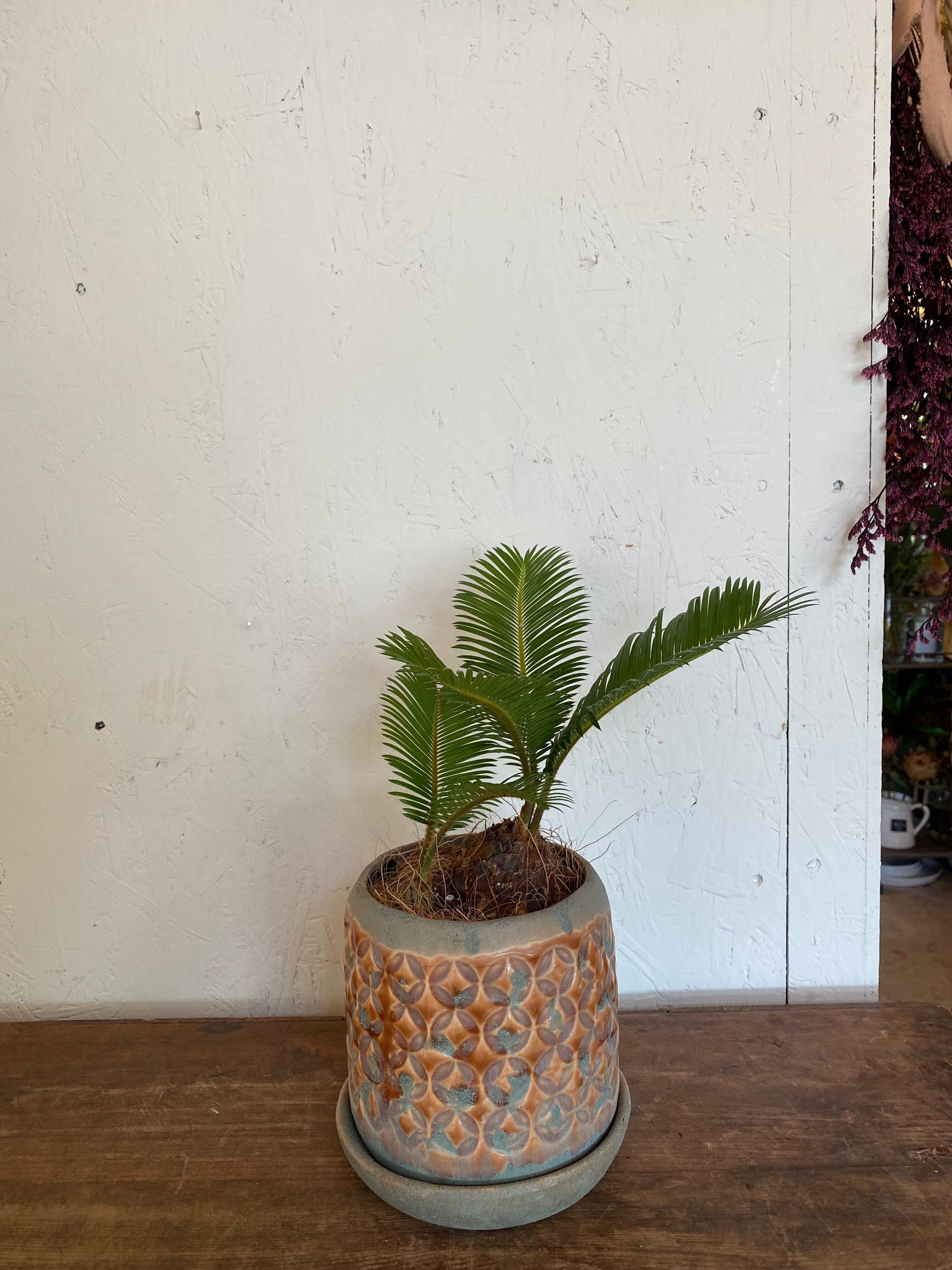 今回は鉢の模様が特徴的なおしゃれな鉢に植え込んでお届けします