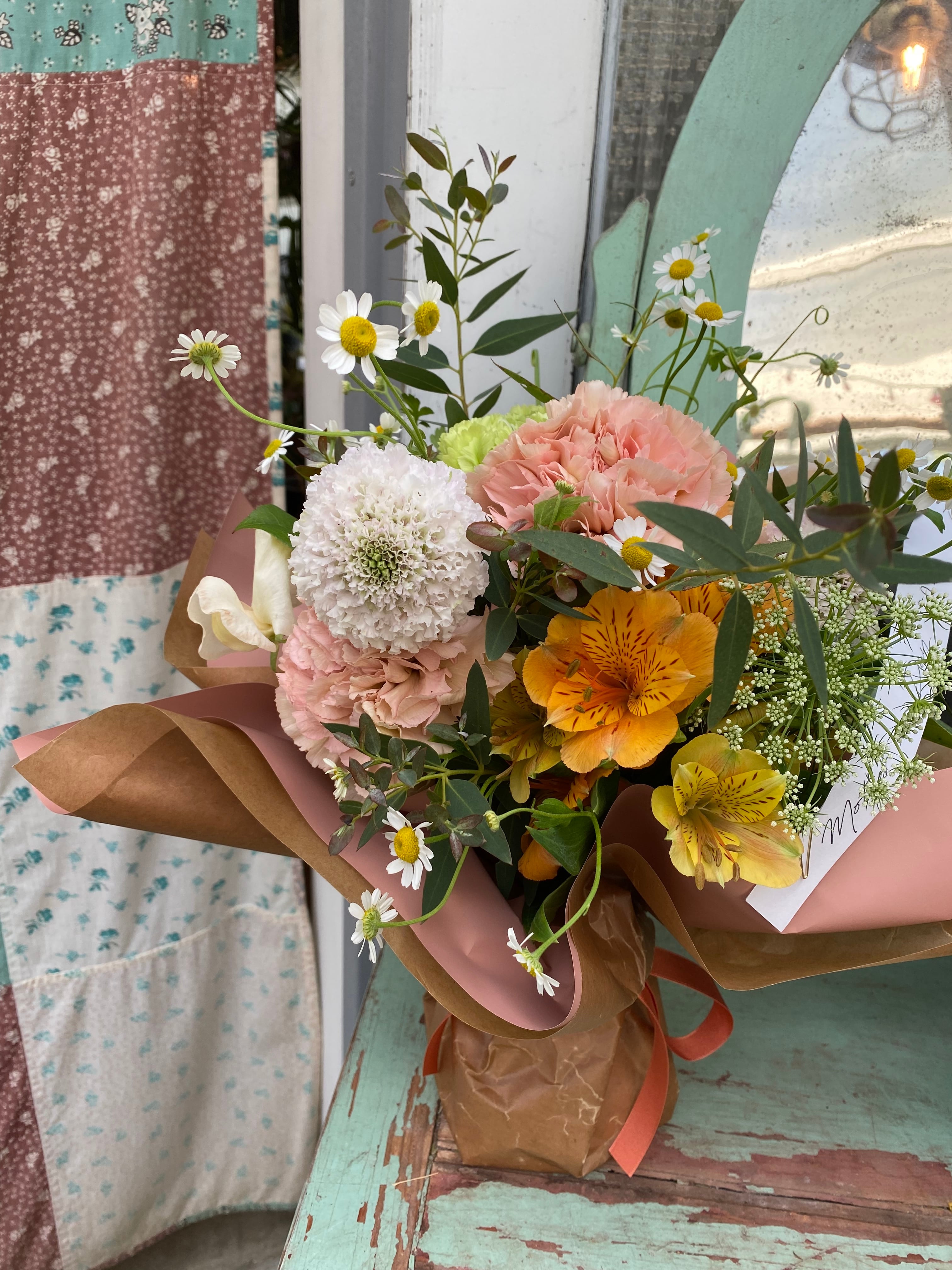 お花の内容はお選びください頂けませんが、その時ある自信を持ってお届けできるお花をお包みします。