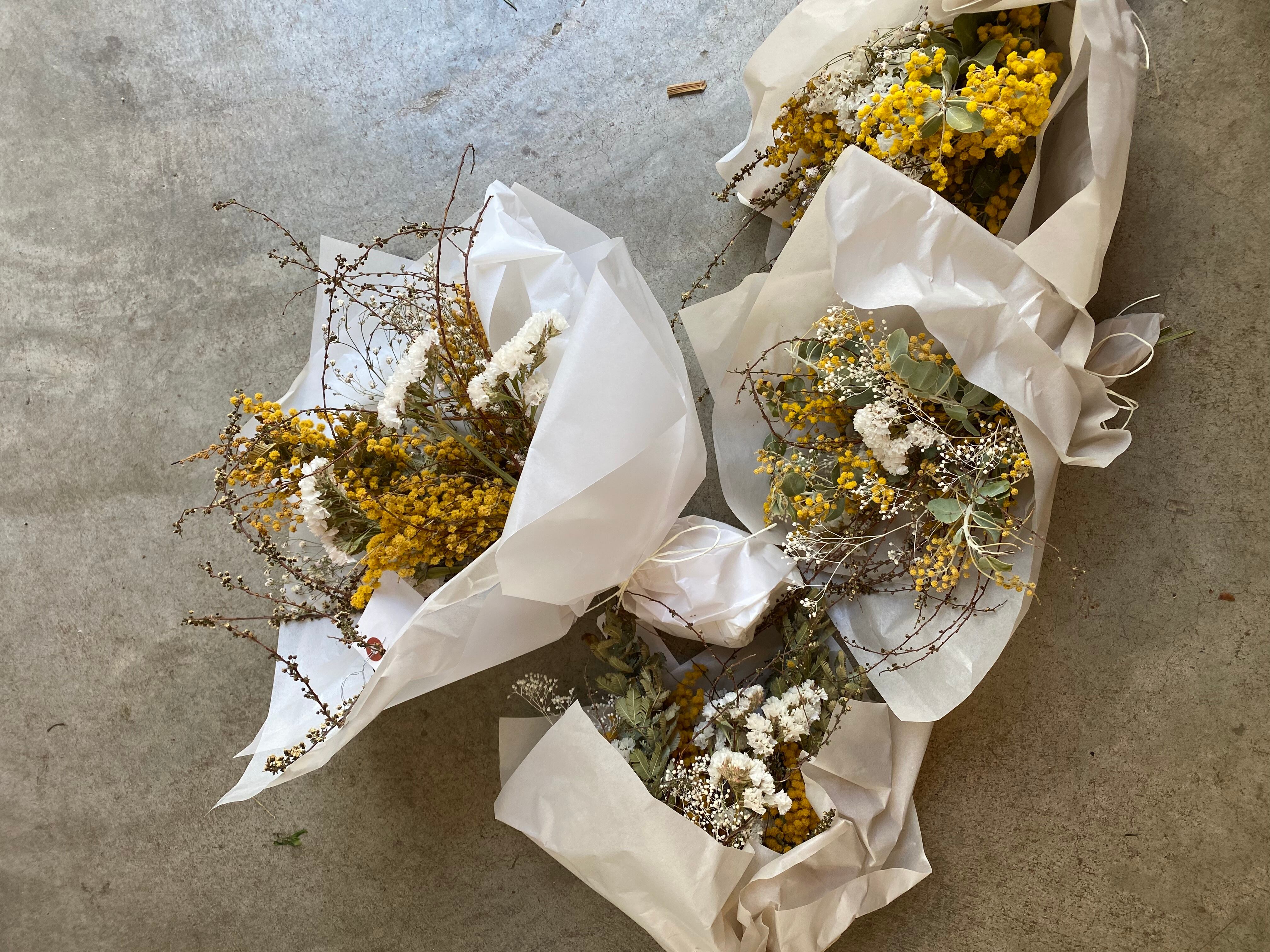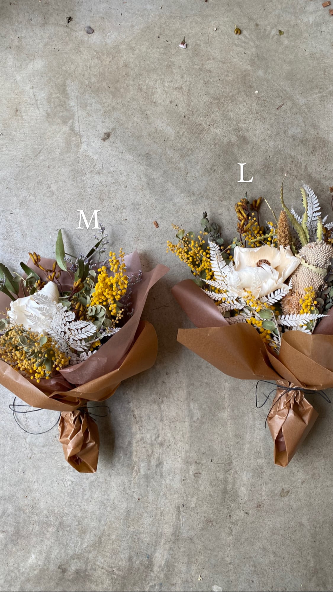 大人気のドライフラワーブーケ「mimosa」が新登場!黄色いミモザを中心に、ナチュラルな雰囲気を演出するグリーンをアレンジ。優しい色味の花々が絶妙なバランスで組み合わされています。